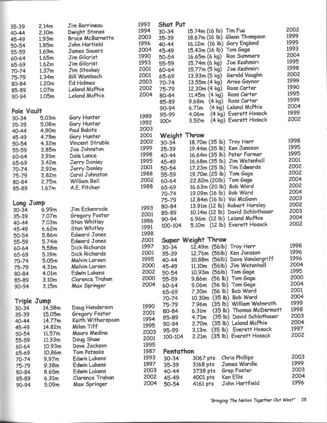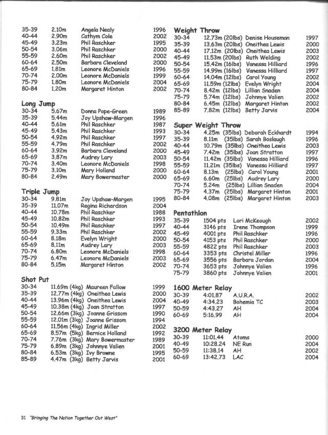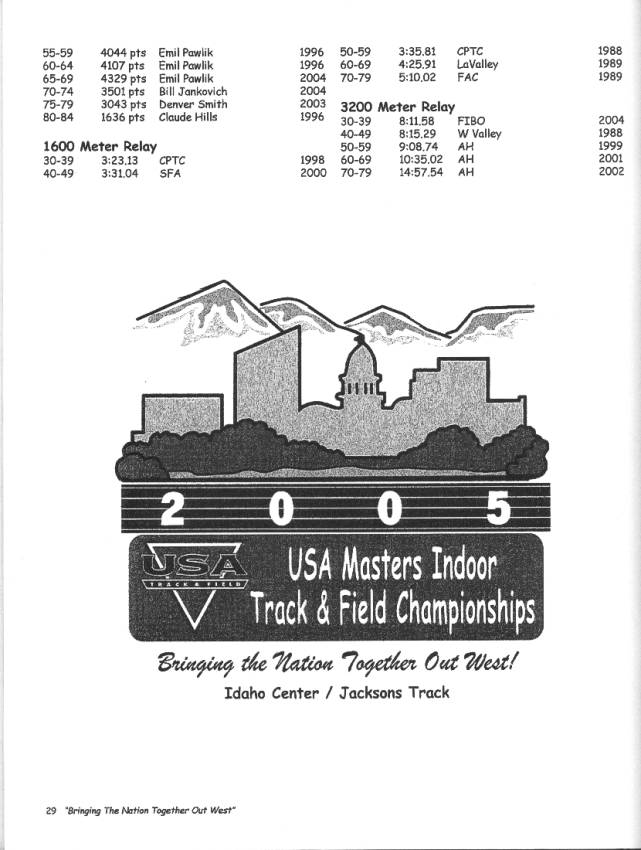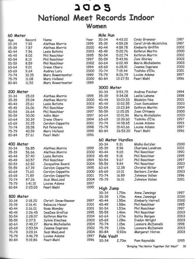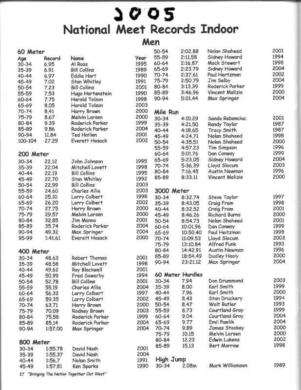 [NOTE: This is a scanned in version of the 2005 National Masters Indoor Track & Field Championship Meet Records. Just to note that at the 2003 National Indoor Meet in Boston, I long jumped 5.87m in the Long Jump during the Indoor Pentathlon competition. This exceeded the listed record of 5.86m for the open long jump.]